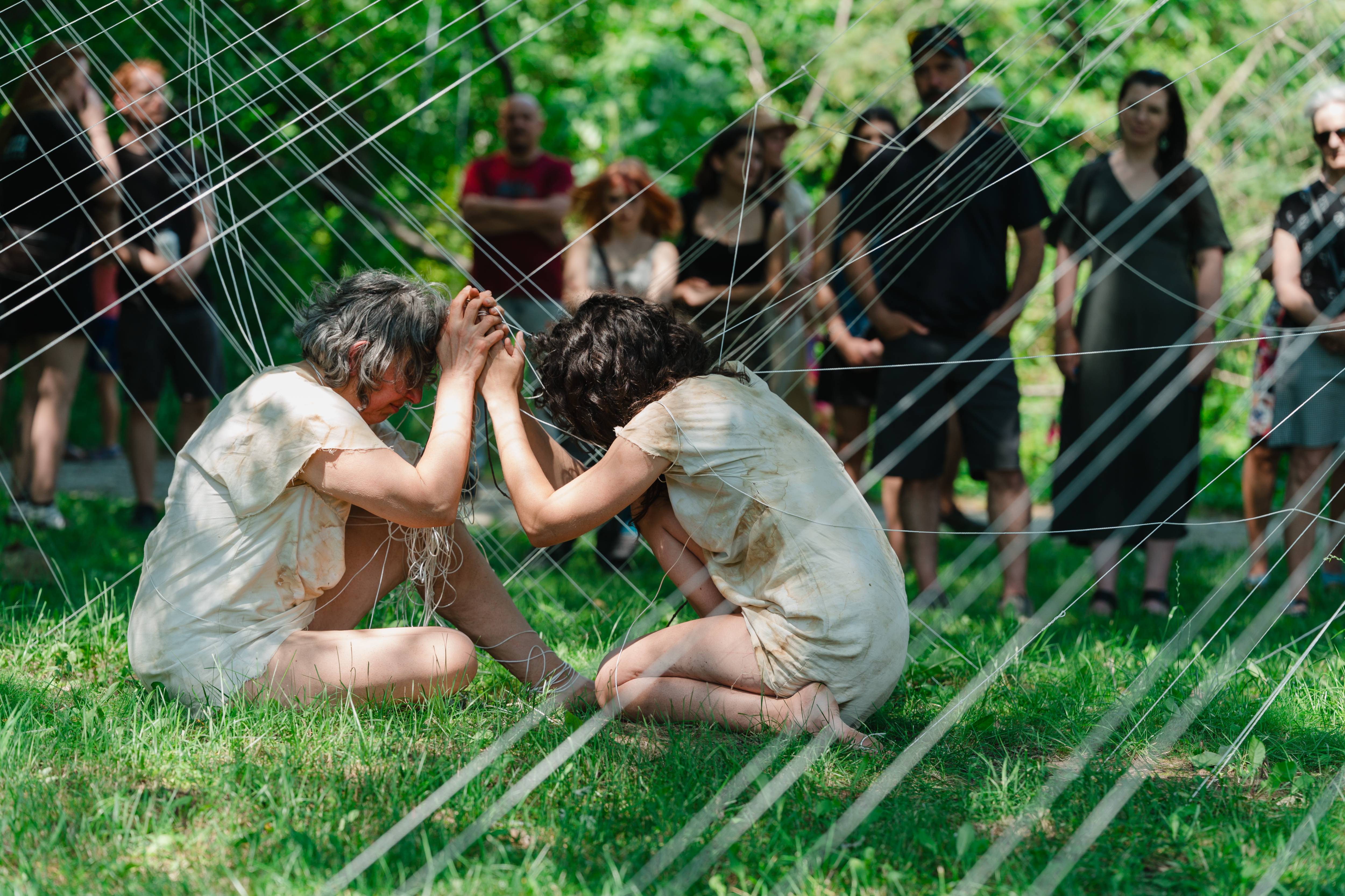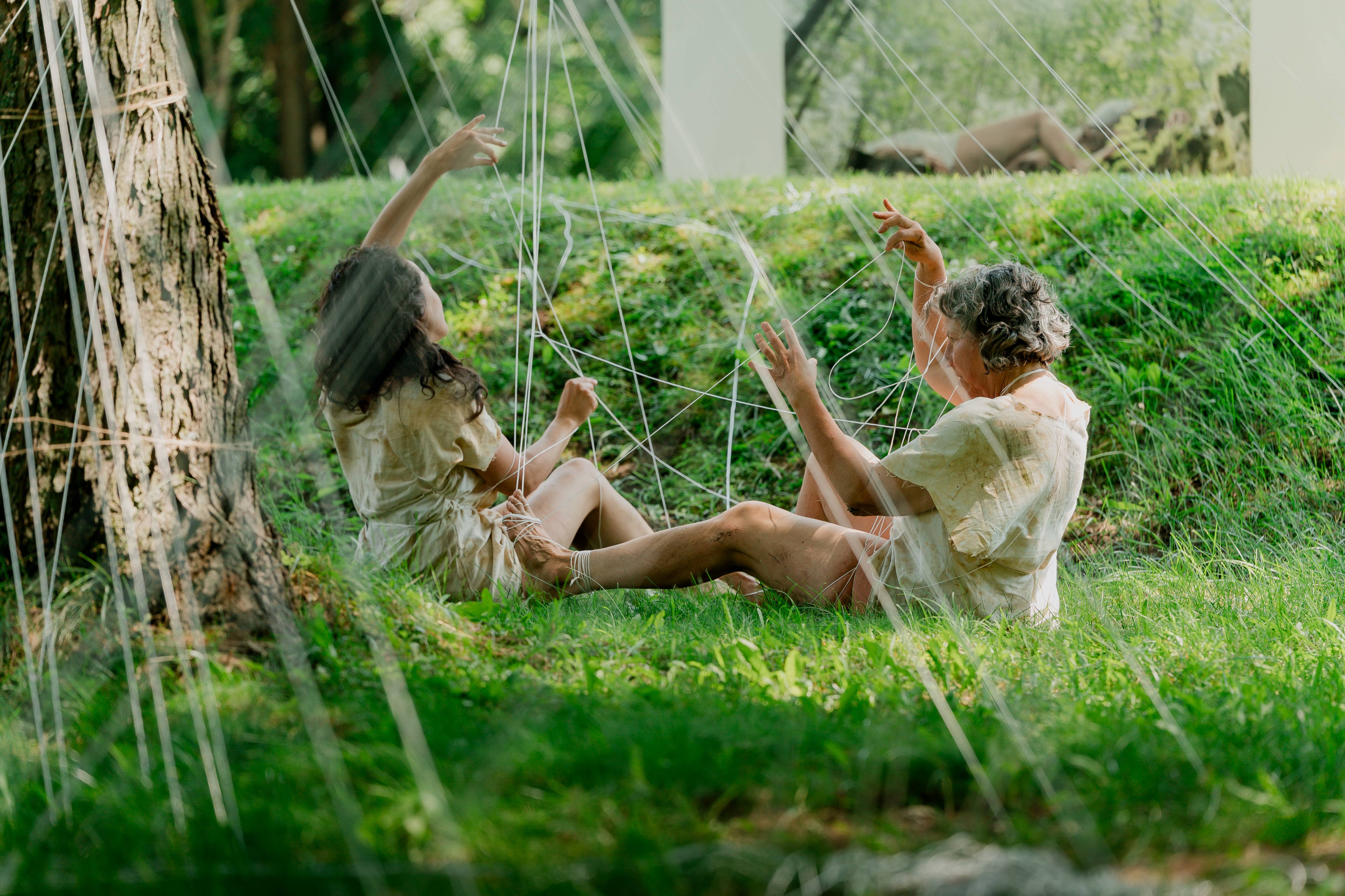Sylvie Michaud et moi avons eu l'honneur d'ouvrir le vernissage des Jardins réinventés de la St-François avec une performance dans notre installation monumentale de cordons de maçon. Comme des tisserandes de lumière, nous avons recréé une architecture sensible du vivant. Un réseau fragile, vibrant, fait d’interconnexions, de porosités, de constructions éphémères. La lumière s’y accroche, s’y diffracte, se rend visible dans ses moindres inflexions. Elle devient matière. Comme nous.